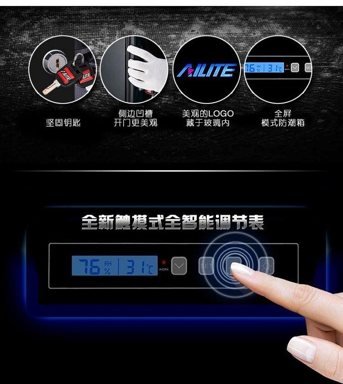3.门与柜体的框架采用了双磁芯吸合这是行业中没有的,这样会使防潮密封更加效果,外界的湿气不会因密封不好而侵入到柜体里面,这样会使除湿速度加快达到所设定值;