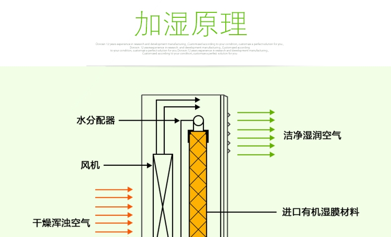 湿膜加湿器利用水的蒸发性,将水通过水泵和分配器不断送到湿膜上部,水均匀地淋到湿膜的顶部,淋水器确保水均匀分配到湿膜材料上,水沿湿膜材料向下渗透,淋湿湿膜内部的所有层面,同时被湿膜材料吸收,形成均匀的水膜.当干燥空气通过湿膜时,空气与大面积的湿膜充分接触,空气中的显热使水汽化,使湿度增加而达到加湿目的。